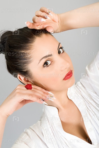 Портрет молодой красивой брюнетки на сером фоне