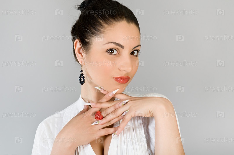 Портрет молодой красивой брюнетки на сером фоне