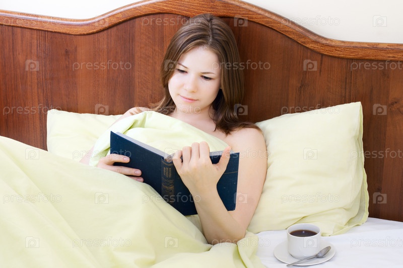 Девушка в постели с чашкой кофе и книгой