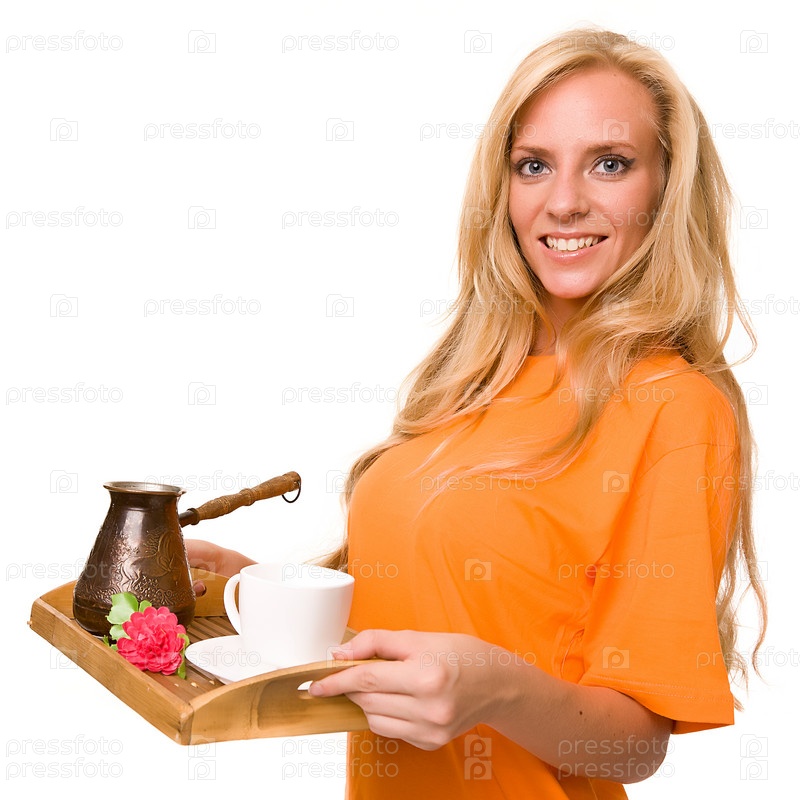 Молодая девушка несет кофе на подносе