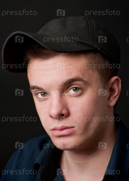 Портрет молодого зеленоглазого человека в кепке на черном фоне