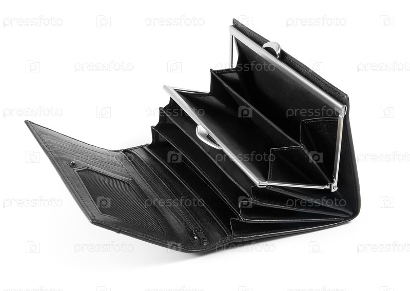 Черный кожаный кошелек на белом фоне