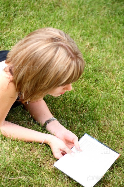Красивая девушка читает на траве в парке