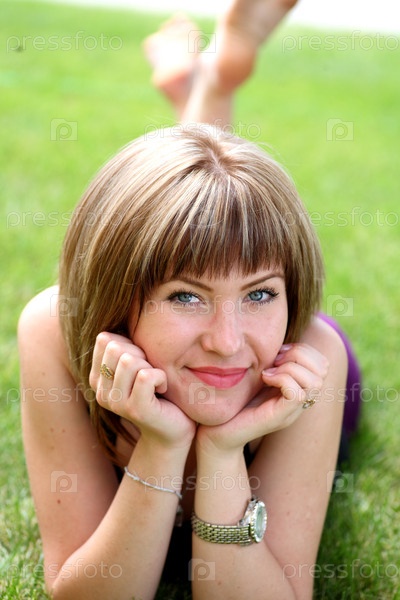 Красивая девушка лежит на траве в парке