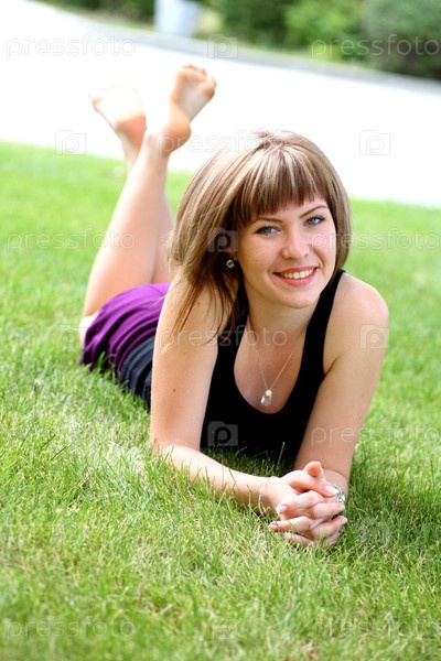 Красивая девушка лежит на траве в парке
