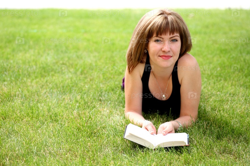 Молодая красивая девушка читает, лежа на траве в парке