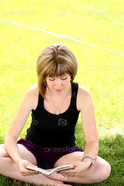 Красивая девушка читает книгу в парке, сидя на траве