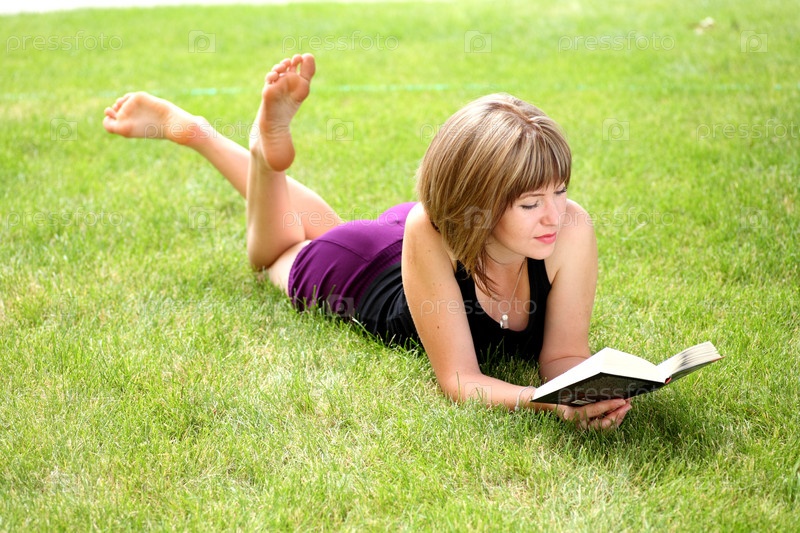 Красивая девушка читает на траве в парке
