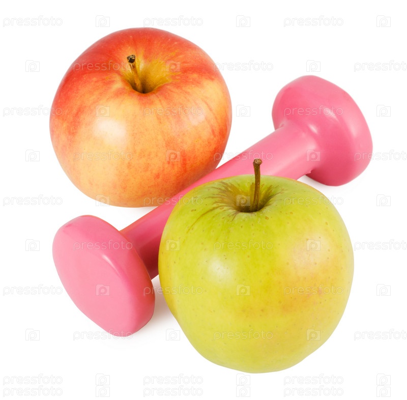 Розовая гантель и два яблока на белом фоне (форма знака %)