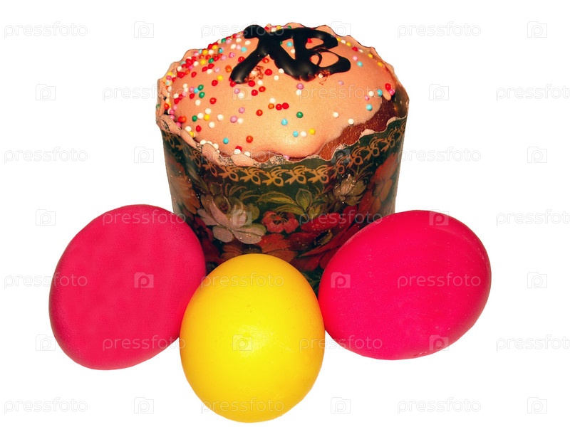 Кулич и три яйца на белом фоне