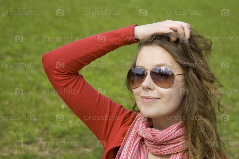 Девушка в солнцезащитных очках на зеленом фоне