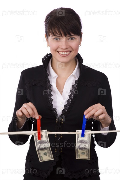 Деловая женщина вешает стодолларовые купюры на шнурке