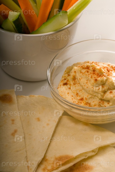 Ближневосточный соус хумус в стеклянной миске с хлебом пита и сырыми овощами
