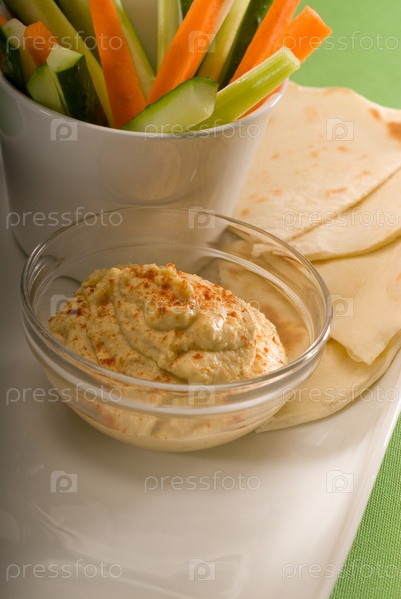 Ближневосточный соус хумус в стеклянной миске с хлебом пита и сырыми овощами
