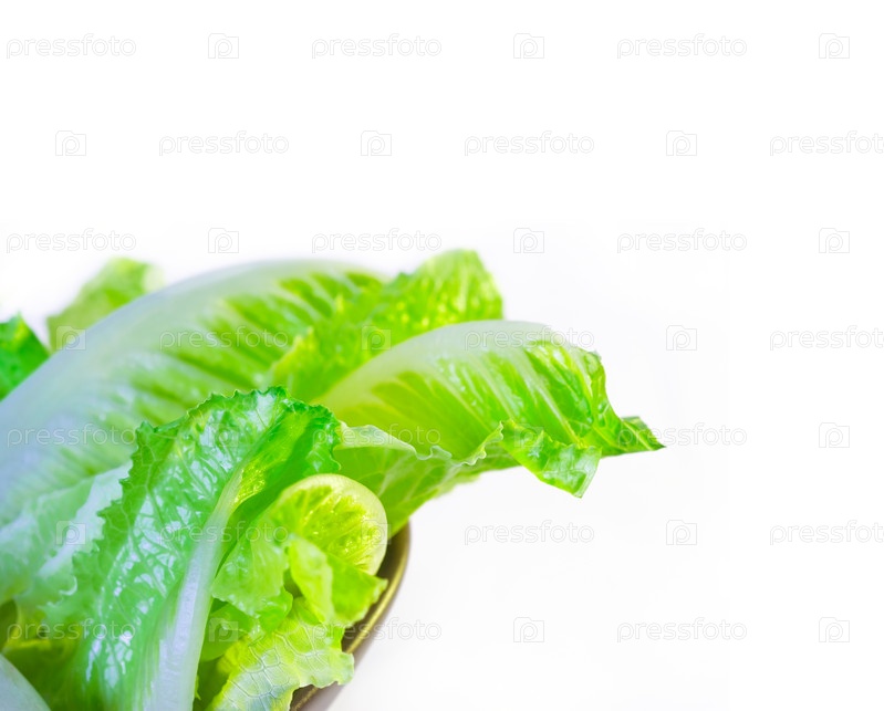Свежие листья салата на коричневой тарелке крупным планом на белом фоне