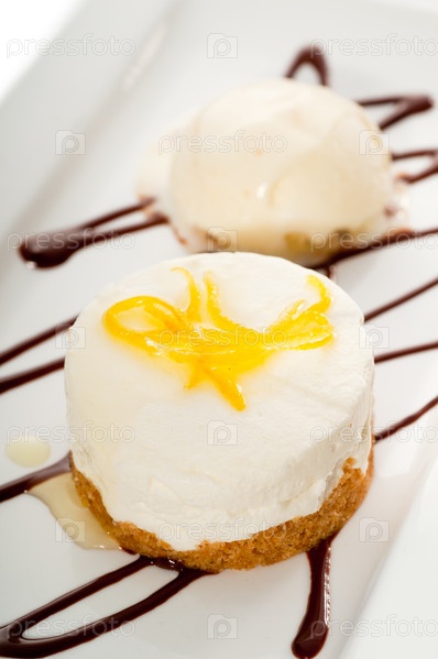 Утонченный лимонный мусс, украшенный сверху лимонной цедрой и сбоку ванильным мороженным