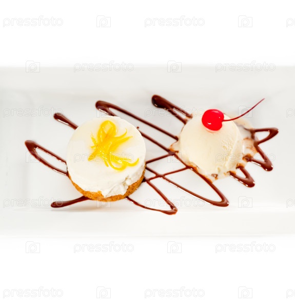 Утонченный лимонный мусс, украшенный сверху лимонной цедрой и сбоку ванильным мороженным