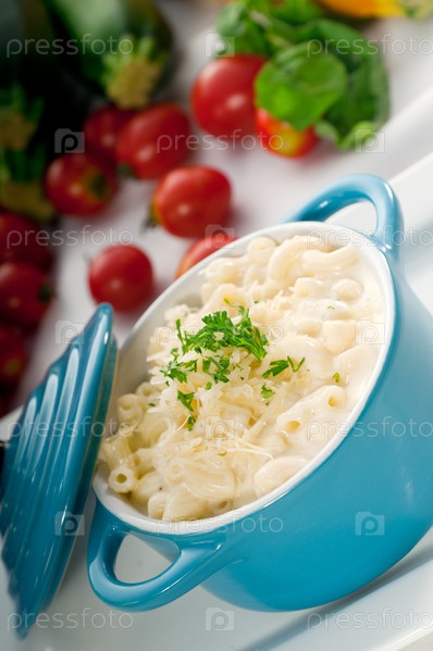 Макароны и сыром, детское любимое блюдо, в голубом глиняном горшочке с овощами на фоне