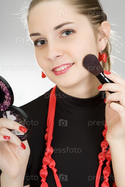 Красивая девушка наносит румяна на лицо