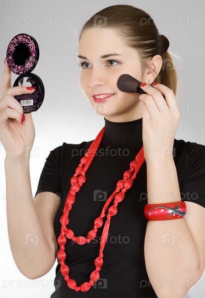Красивая девушка наносит румяна на лицо
