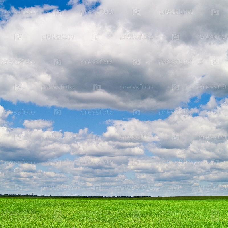 Зеленый луг под голубым облачным небом
