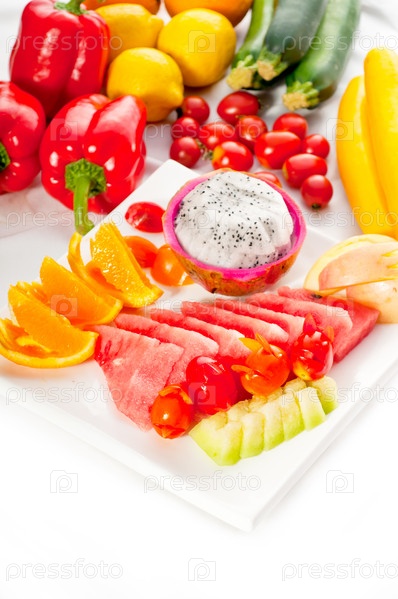 Тарелка со свежими питайей, красным драконом, арбузом, апельсином, яблоком и помидорами черри