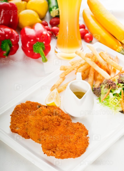 Классические миланские телячьи котлеты в панировке с французским картофелем и овощами