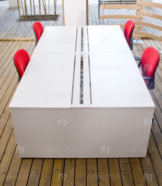 Офисные столы и красные стулья в кабинете с деревянным полом. Вид сверху