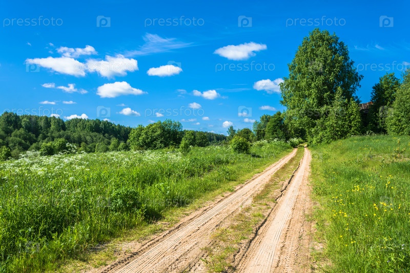 Грунтовая песчаная дорога среди зеленой травы