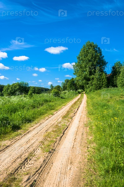Грунтовая песчаная дорога среди зеленой травы