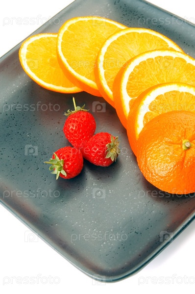 Апельсин и клубника на тарелке на белом фоне
