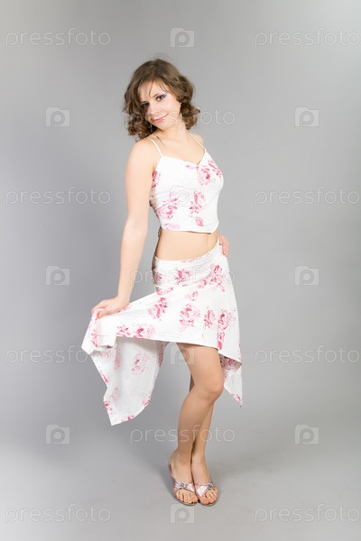Красивая танцующая девушка на сером фоне