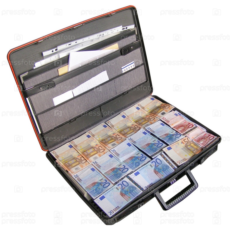 Деньги в чемодане на белом фоне