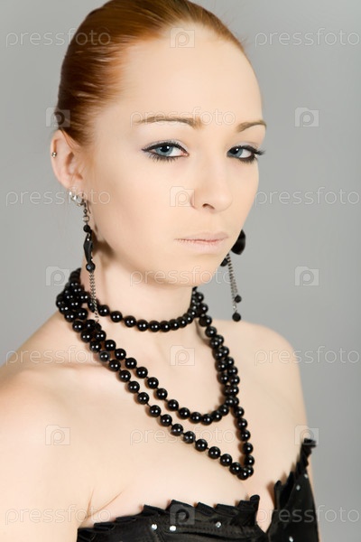 Портрет красивой девушки с черными бусами на шее