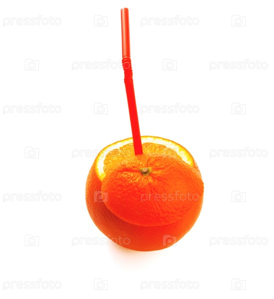 Свежий спелый апельсин с соломинкой на белом фоне