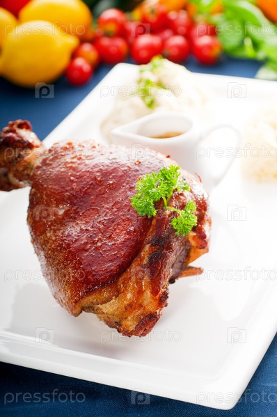 Жареная немецкая свиная рулька с картофельным пюре и квашеной капустой