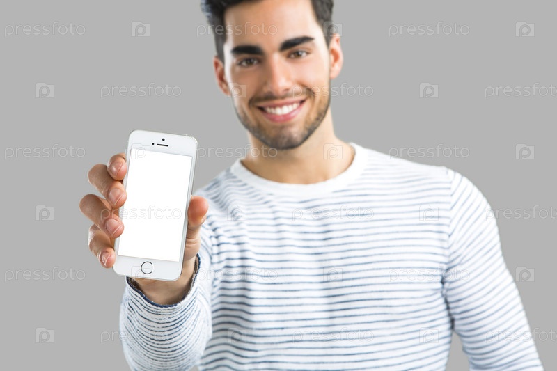 Показывая что-то на телефоне