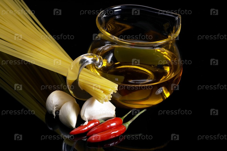 Спагетти с чесноком, перцем и оливковым маслом на черном фоне