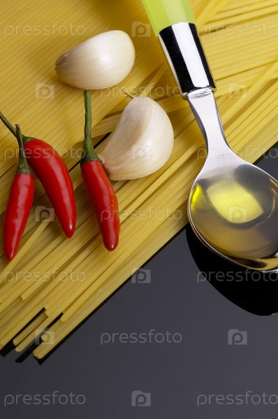 Спагетти с чесноком, перцем и оливковым маслом на черном фоне