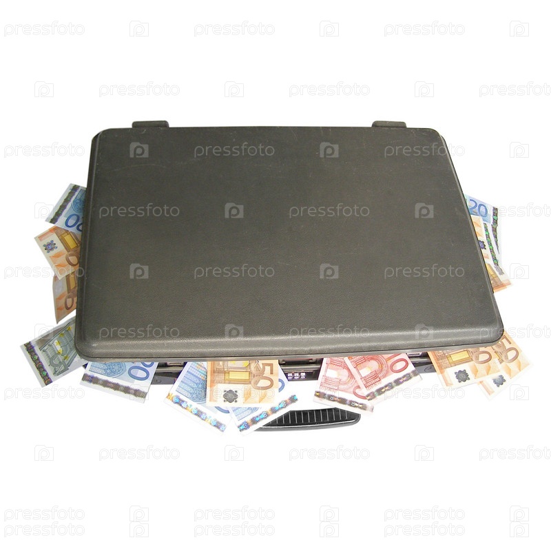 Деньги в чемодане, изолированном на белом фоне