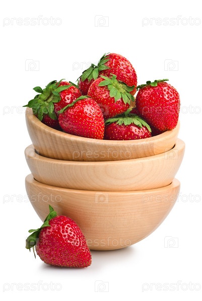 Деревянные чашки с клубникой, изолированные на белом фоне