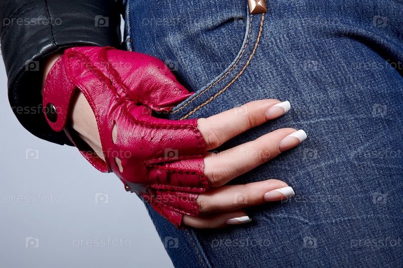 Женская рука в стильной перчатке на джинсах