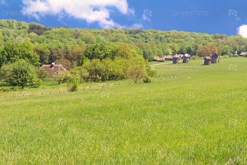 Старые ветряные мельницы на весеннем лугу