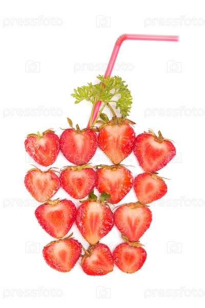 Клубника в форме стакана сока с соломинкой на белом фоне