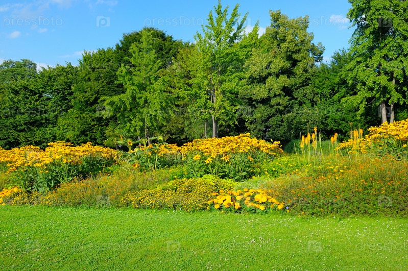 Летний парк с красивыми клумбами
