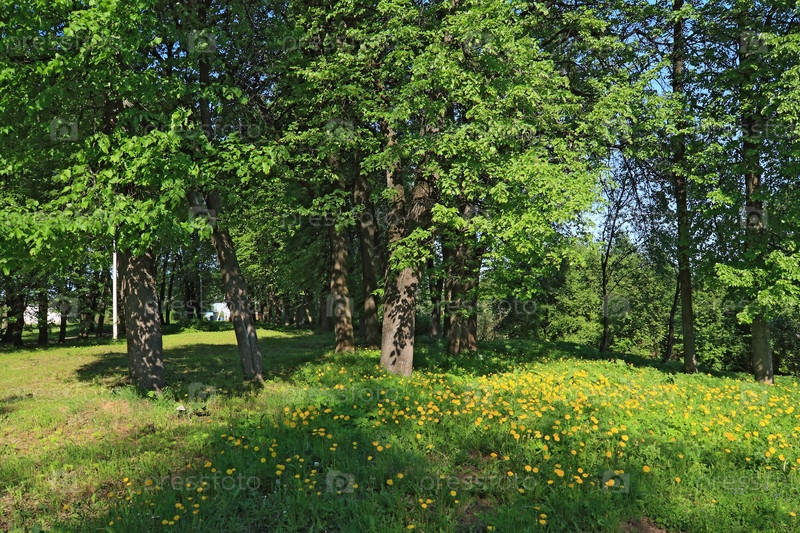 Желтые одуванчики в весеннем лесу