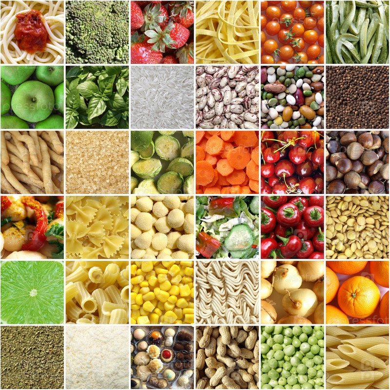 Коллаж из овощей, фруктов, макаронных изделий и другой пищи