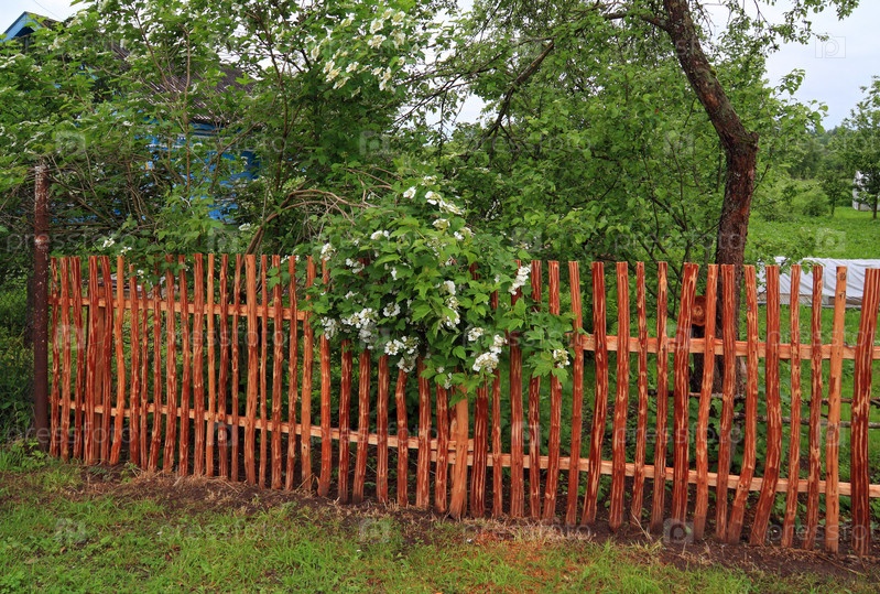 Цветущая калина возле деревянного забора
