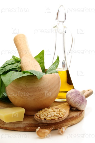 Оливковое масло, базилик, кедровые орехи для песто на деревянной доске
