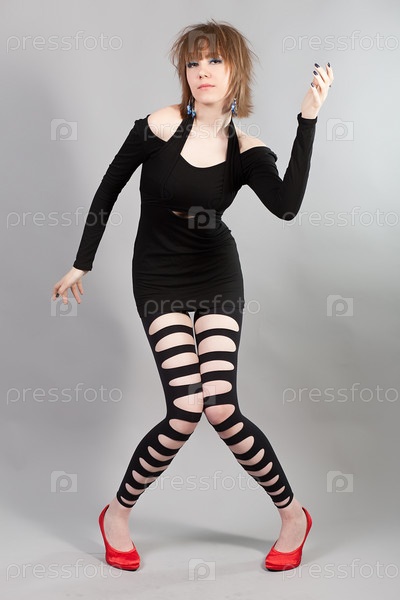 Портрет привлекательной девушки в красных туфлях и черном платье